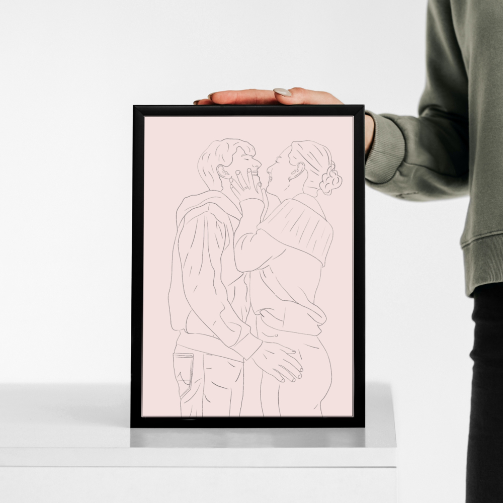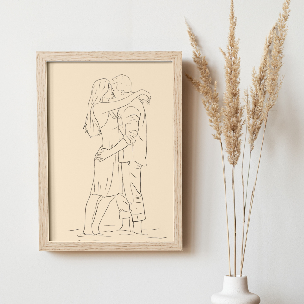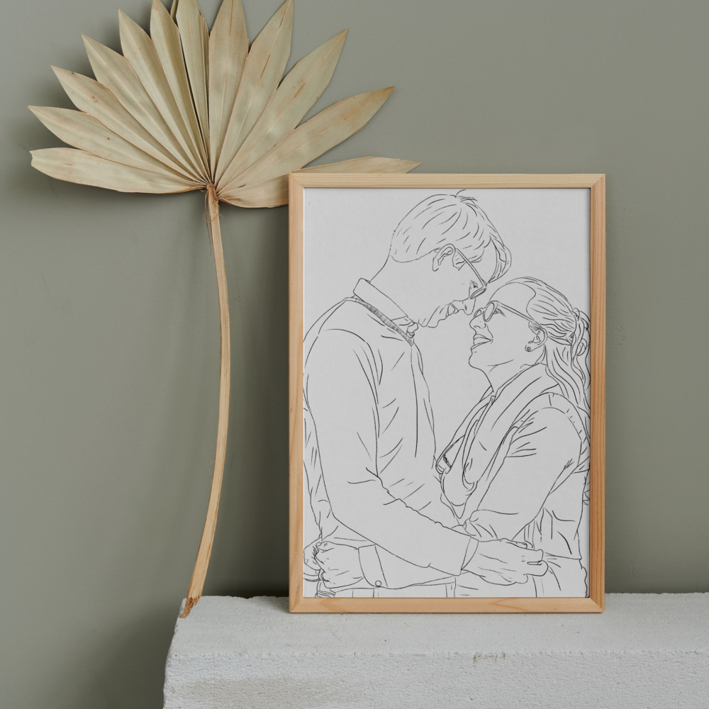 Een lijnportret is een minimalistische maar krachtige manier om een herinnering vast te leggen met vloeiende lijnen. Dit kan van één foto, maar ook van meerdere foto's samengevoegd. Elke creatie vertelt een uniek verhaal op een moderne en stijlvolle manier.